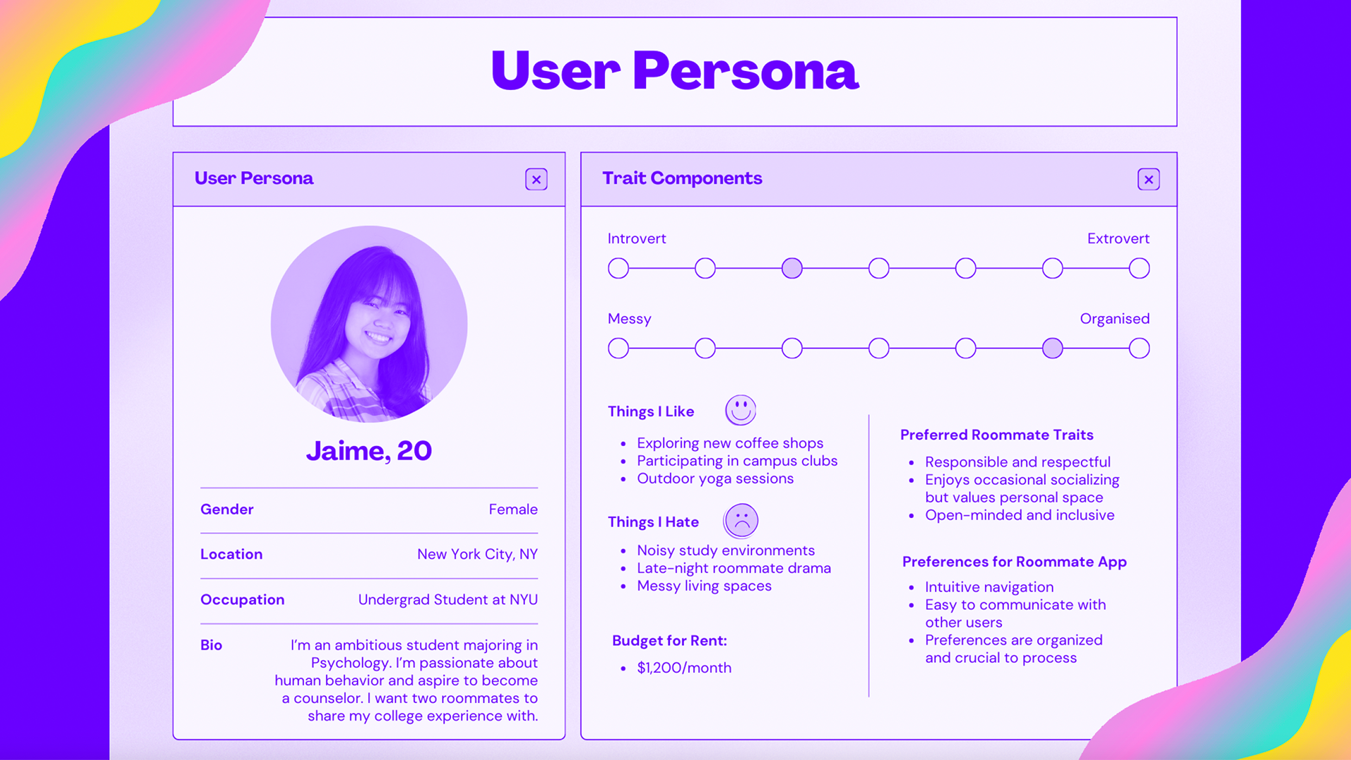 2024 Undergraduate Research Symposium at KU through Honors, focusing on challenging traditional roommate matching services for college students using modern UX design principles.